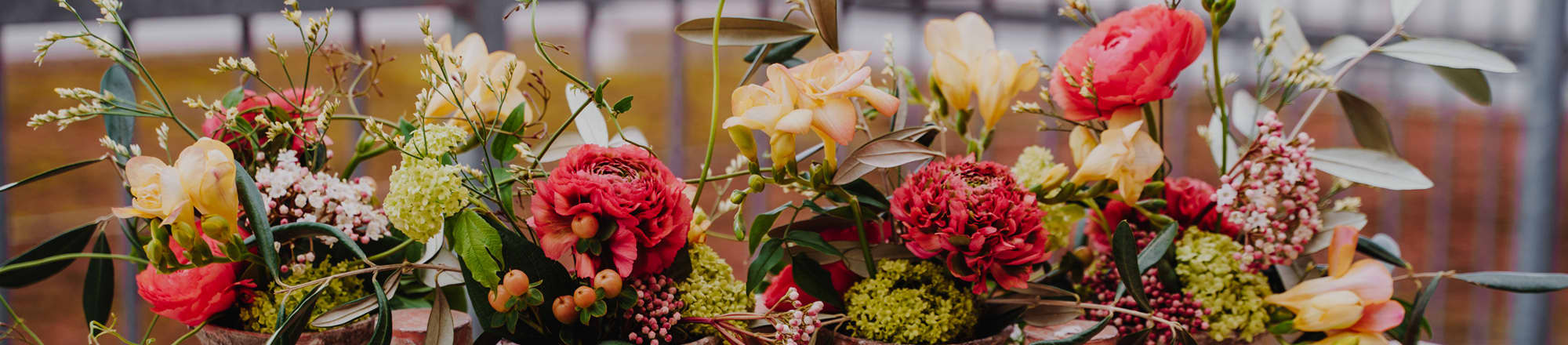 diverse Blumen (z.B. Freesien, Ranunkeln, Viburnum, Limonium und Olivenzweige); kleine Plastiksäcke.